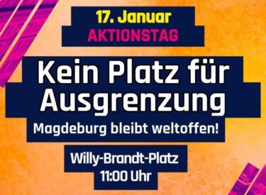 Die Aktionswoche „Eine Stadt für alle“ findet vom 16. bis 27. Januar 2026 statt. Organisationen und Vereine, Gruppen und Einrichtungen, die sich für ein weltoffenes, tolerantes und demokratisches Magdeburg einsetzen, wirken mit eigenen Ideen und Formaten an der Gestaltung mit.