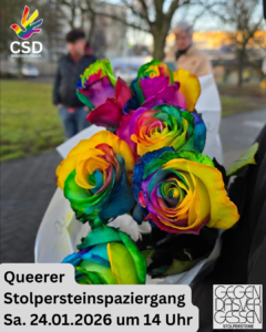 Benno Meyer, Paul Juhe, Fritz Arnold Kruse, Paul Klotz. Diese Männer wurden im Nationalsozialismus getötet – weil sie homosexuell waren und andere Männer geliebt haben. Der CSD Magdeburg e.V. organisiert zur Erinnerung an diese Männer einen queren Stolpersteinspaziergang. Die Stolpersteine werden gereinigt, anschließend werden Informationen zu den Biographien der jeweiligen Männer verlesen, es gibt eine Schweigeminute und regenbogenfarbene Rosen werden zur Mahnung und zur Erinnerung an den Stolpersteinen abgelegt. Interessierte sind eingeladen, sich an der Aktion des CSD für mehr Toleranz und gegen das Vergessen zu beteiligen – gern auf dem gesamten Rundgang oder nur bei einzelnen Stolpersteinen.